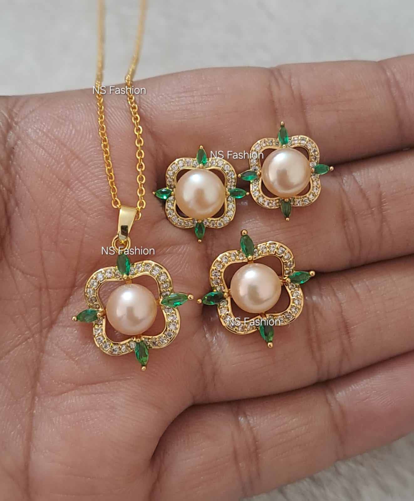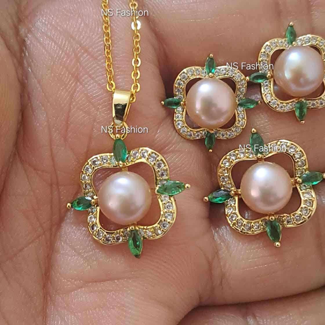 Green Stone With Original Pearl Pendant Set